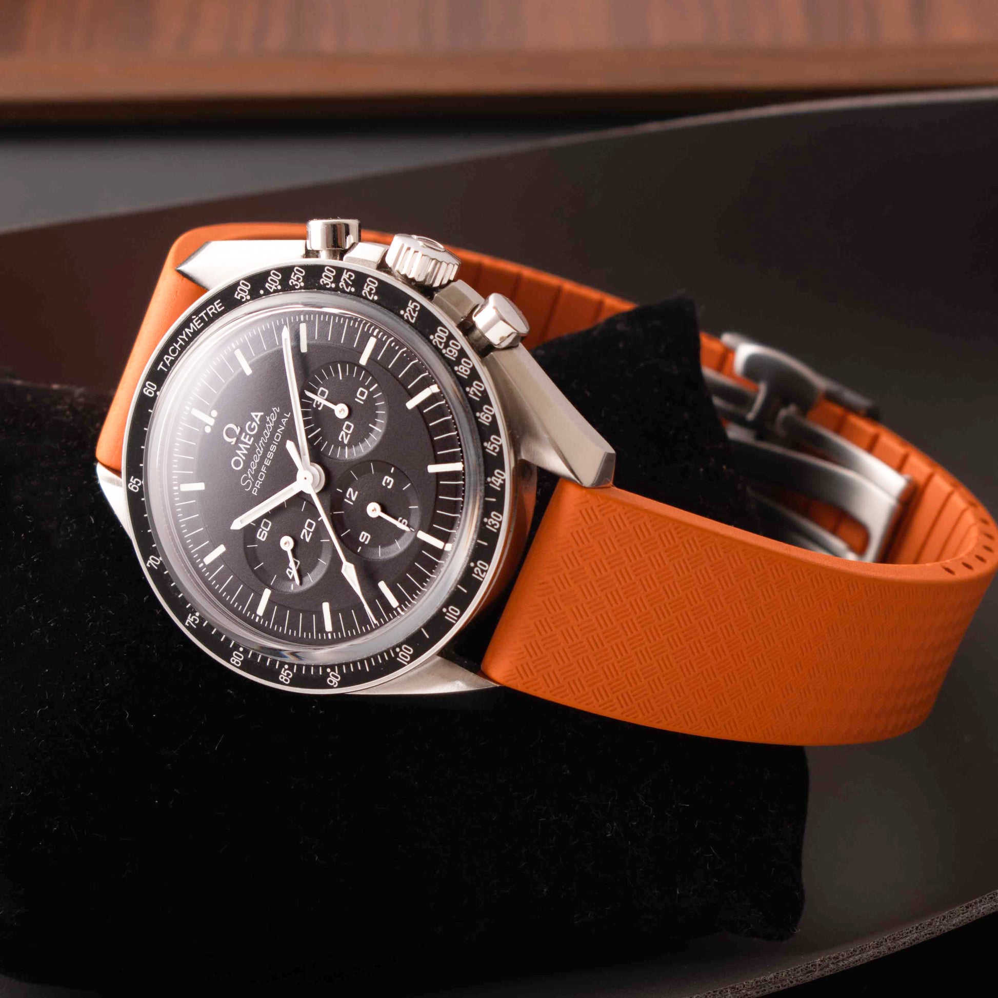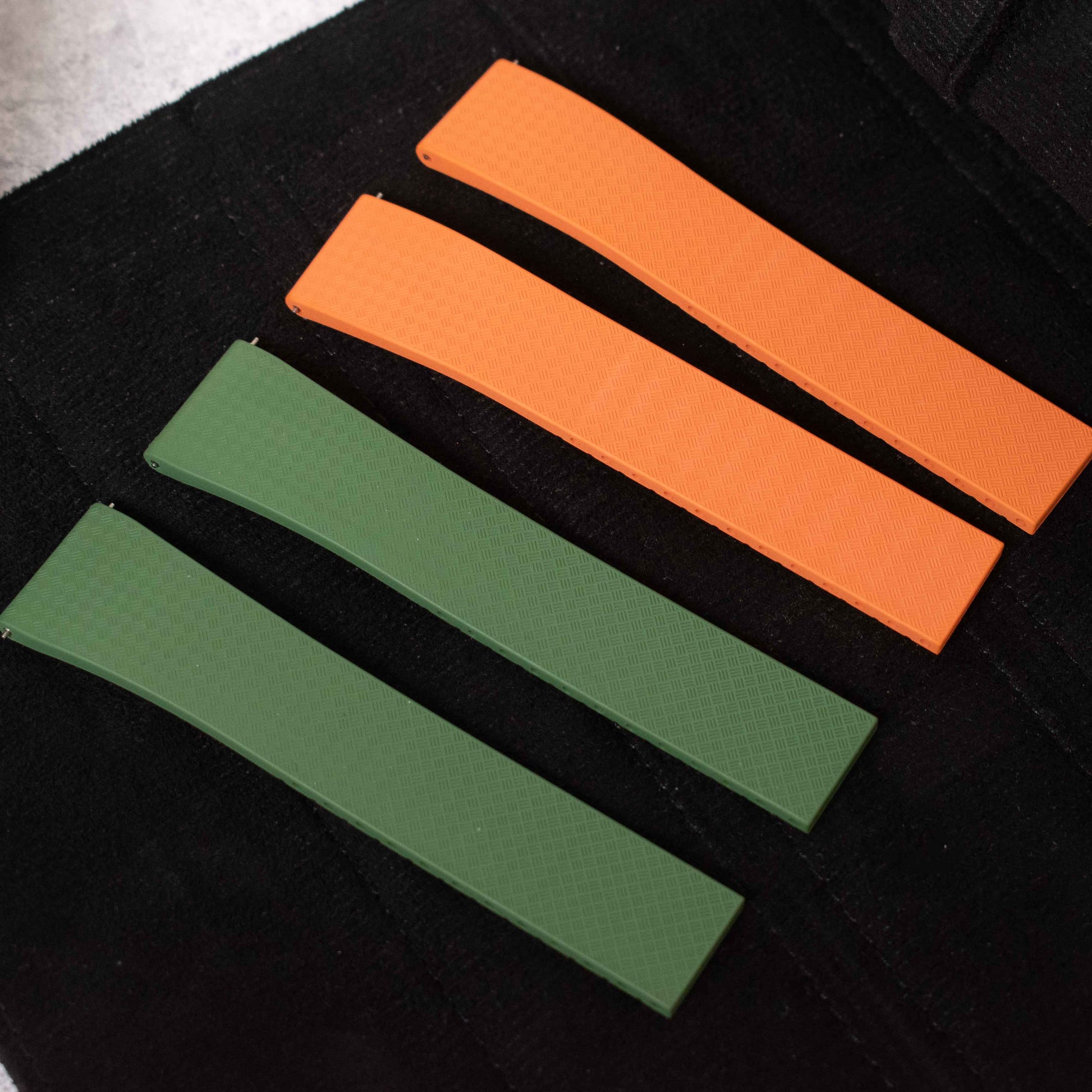 Crafted from high-grade FKM rubber, the strap follows a contemporary tapered profile, aligning with today’s design preferences while keeping proportions balanced. The clean, refined finish complements larger and sport-driven watches without overpowering them.
