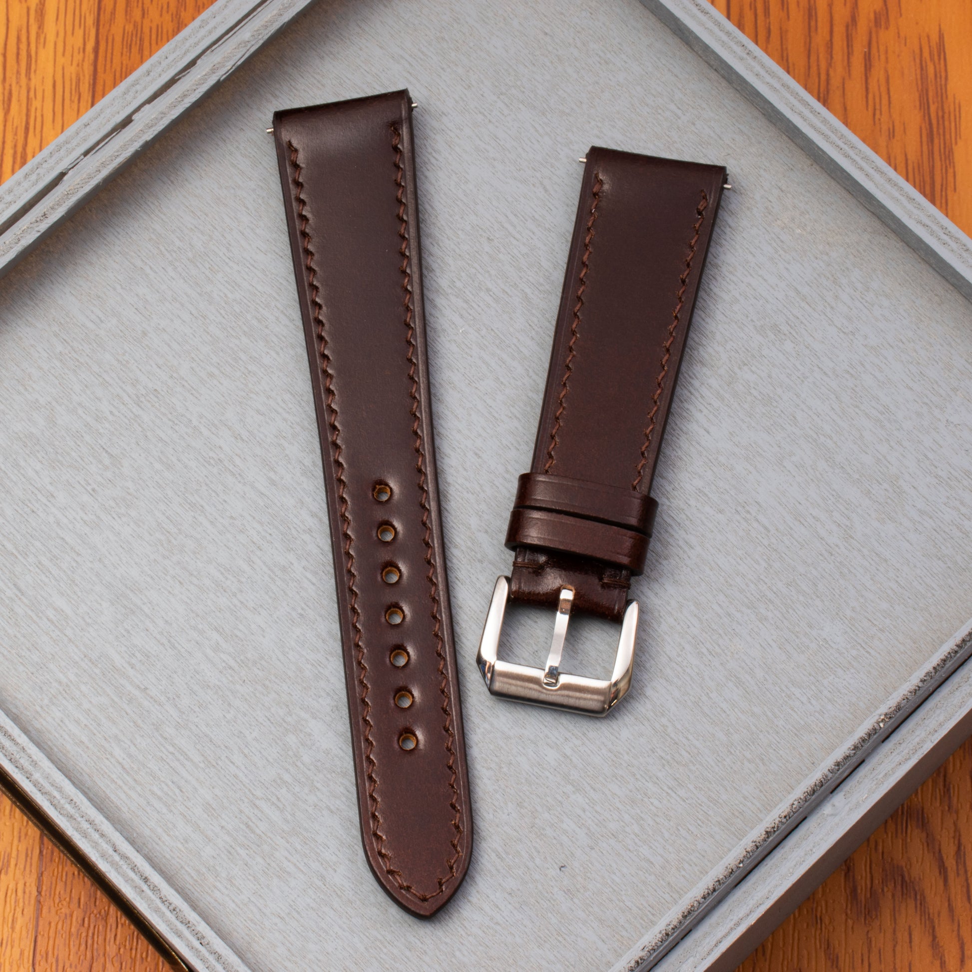 The next generation of Shell Cordovan straps is available in 4 colors: Navy blue, Olive green, Light brown and my personal favorite Chocolate brown.