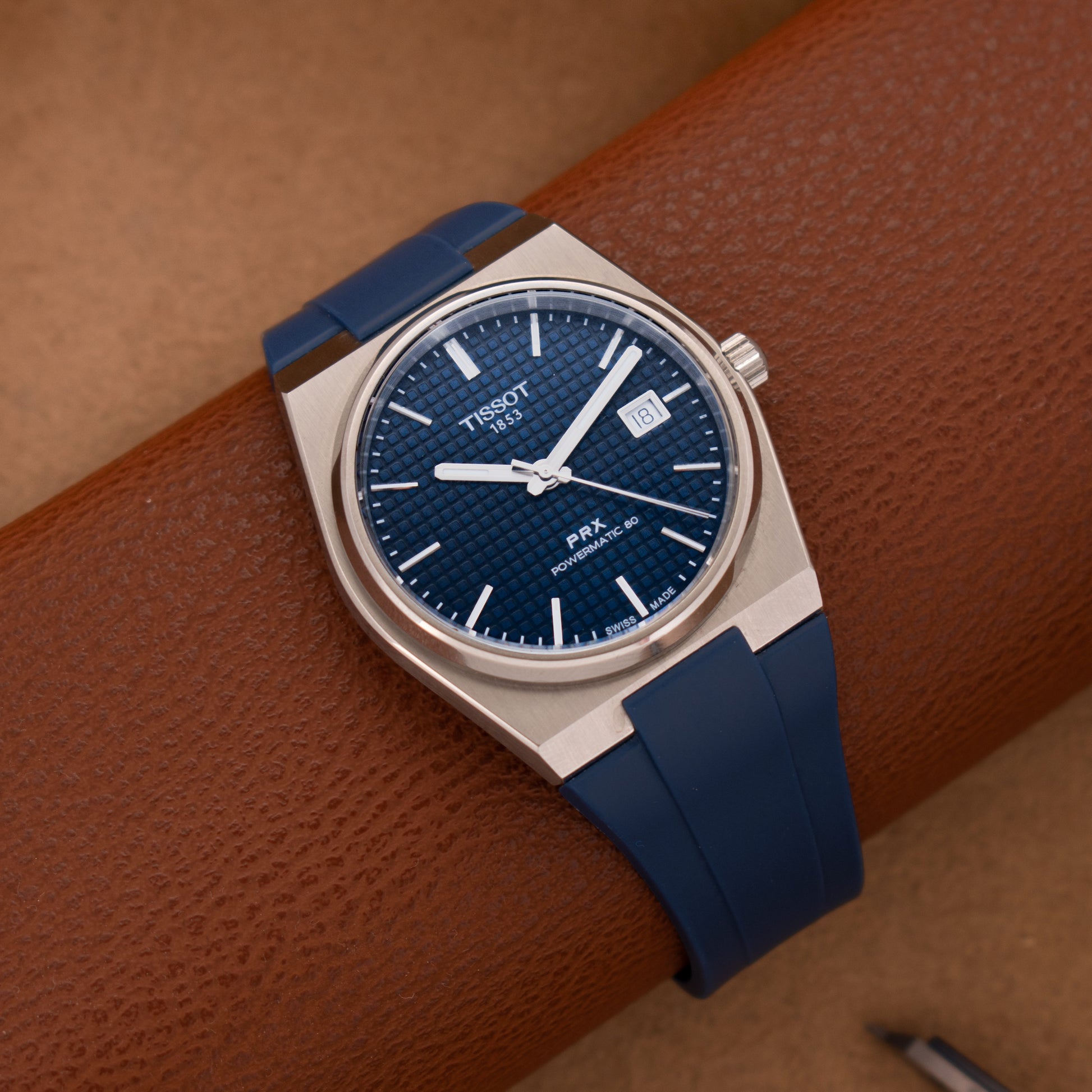 Form-fitting and durable, the TISSOT PRX Rubber strap is compatible with all PRX models with a 40mm diameter.